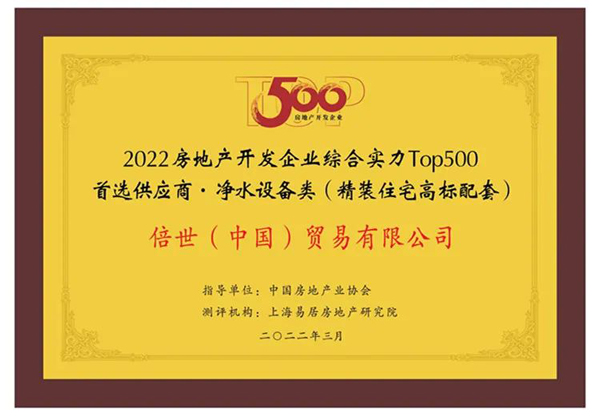 倍世(中国)凭借卓越突出的综合实力,荣膺《2022房地产开发企业综合实力top500首选供应商· 净水设备类(精装住宅高标配套) 》代表企业!