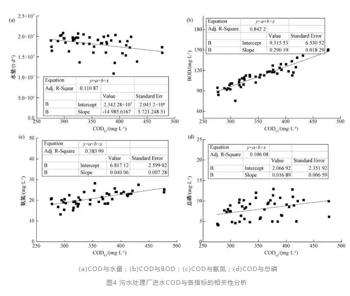 2015年—2018年,该污水处理厂进水cod与水量、bod、氨氮、总磷的相关性规律如图4所示。进水cod与进水水量以及总磷的相关性不显著,分析原因可能是进水中工业废水占比较高;总磷与cod排放的相关性不显著,是由于排放含磷较高废水的工业企业不定期排放;进水cod与bod以及氨氮的相关性较显著且稳定,这与进水中工业废水占比较高的分析相一致。进水总磷波动较大,说明在污水厂的运行中需注意磷的去除情况,如有必要可增加强化除磷措施。