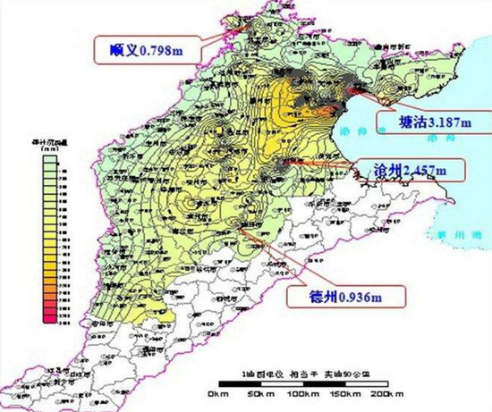 据统计最近三十年的时间,北方地下水开采量在以每年25亿立方米的速度增加,也正是因为北方农业用水量的急剧性增加,如今北方的河北平原以及北京平原地带的地下水资源开采量已经累计达到500亿立方米、60亿立方米,沧州地区地下水位下降最大幅度达100米,低于海平面80余米。