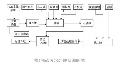 滨海热电一期装机容量为2×300mw燃煤机组,每台机组配套一套石灰石-湿法脱硫装置,为控制脱硫系统内浆液中的cl-、f-等杂质,保证脱硫系统的正常运行,配置了一套脱硫废水处理系统装置,设计废水处理能力为15t/d,工艺采用化学沉淀法。该废水处理系统通过向废水中投加石灰、混凝剂、有机硫,在一定的ph范围内,对水中的过饱和盐类和重金属离子进行处理,产生泥饼外运处理。脱硫废水处理系统简图如图1所示。