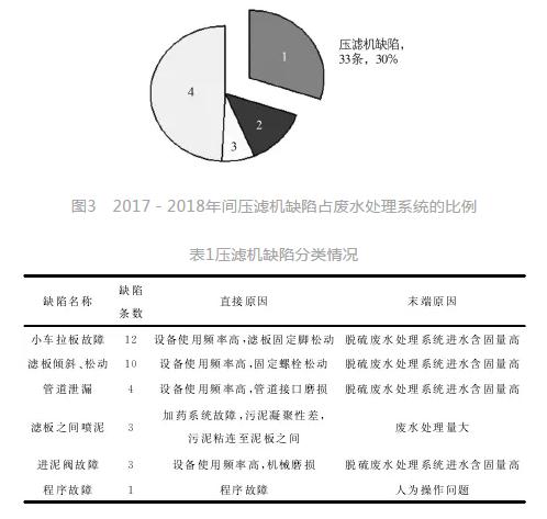 自系统投运以来,压滤机使用频率较高,故障频率也居高不下,以2017-2018年为例(如图3所示),一期脱硫废水处理系统缺陷条数为107条,其中压滤机33条,为系统单体设备数量最多,占到整个废水处理系统的30%。对压滤机设备缺陷的整理分类,分析出其故障的直接原因及末端原因,具体见表1。