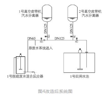 为减少脱硫废水含固率,对废水进水进行改造工作,将废水旋流站二级脱水系统取消,收塔浆液经石膏旋流站一级脱水后,底排浆液进入真空皮带机系统进行脱水,而旋流浆液回流至吸收塔内,真空皮带机系统汽液分离器底排由原有回至回用水池,新增一路至脱硫废水处理系统,在需要排废水的情况下,通过dn65的管道至废水系统。改造后的系统如图4所示。