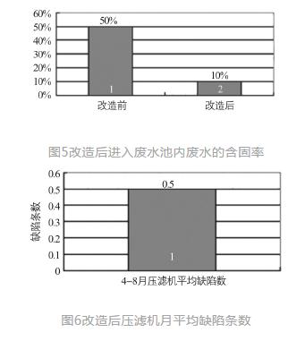 通过图5、图6可以清楚地看出,此次改造后脱硫废水含固量下降了40%,4-8月压滤机的月平均缺陷数量降低至0.5条/月。同时,减少了脱硫废水污泥的产生量及废水池曝气风管清理的频率。