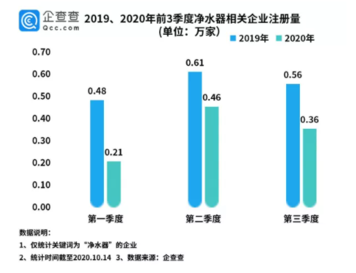 企查查数据显示,2020年前三季度共新增10000余家净水器相关企业,同比降38.5%。其中第一季度受疫情等因素影响,注册量仅2000余家,同比下降57%。第二季度回升至4600余家,环比增长119%,同比下降25.6%。第三季度注册量有所回落,达到3600余家。尤其对这个尚未完成“产品普及和消费升级”的产业,最大的挑战莫过于与不确定性共处的同时,不断进化找到新的增长空间。