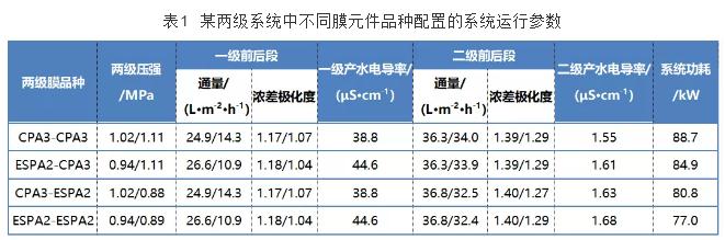 本研究所示数据均由海德能设计软件计算得出。由于该软件对于二级系统脱盐率的计算结果偏高,故二级系统产水含盐量偏低,相关数据仅供工艺效果的对比之用。