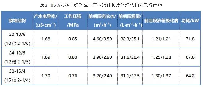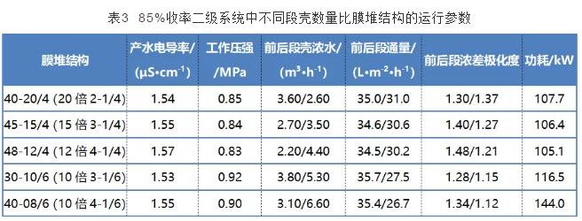 (3)回收率85%的二级系统应该采用8 m的短系统流程与3-1/4或其整倍的膜堆结构。