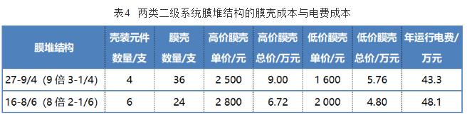 设6芯膜壳的价格为2 000~2 800元,而4芯膜壳的价格为1 600~2 500元,并设系统年运行8 000 h且电价为0.8元/(kw·h)。