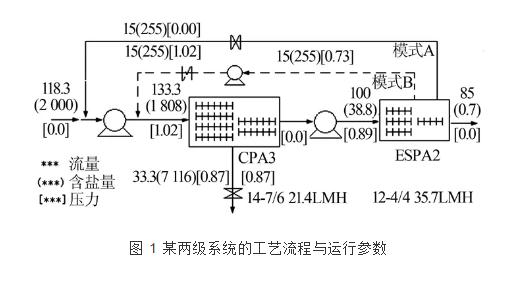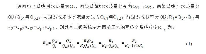 由于二级系统的产水含盐量远低于一级系统的进水含盐量,故二级系统浓水总是回流至一级系统前,与一级系统进水混合为一级系统给水。该工艺结构不仅提高了两级系统的回收率,也在一定程度上提高了两级系统的脱盐率。