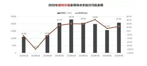 根据中怡康的调研监测数据,2020年1-9月家用净水系统在10城市125家建材渠道达成销量269千台,是建材渠道需求量最大的家电产品,实现零售额14.38亿元,同比增长9.2%。受今年疫情因素影响,线下建材终端门店闭店及限流的影响,在疫情高峰期第一季度家用净水系统销售规模探底,二季度后复苏反弹,5月份为上半年最高峰值,后续月份增长强劲。