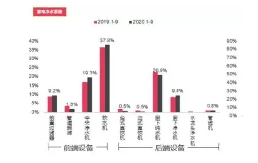 中怡康的调研监测数据显示,建材市场家用净水系统前端设备产品类型主要以软水机、中央净水机、前置过滤器为主,其零售额占比分别为38%、19%、9%,管道超滤占比下降仅为2%;后端设备主要以厨下反渗透纯水机和厨下微滤(含超滤)净水机为主,零售额占比分别为21%和9%,其他后端设备如台式直饮机、立式直饮机、管线机占比皆不到1%,水龙头净水机主要在电商活跃,建材渠道甚少。因此,在建材渠道,产品属性特征很鲜明。