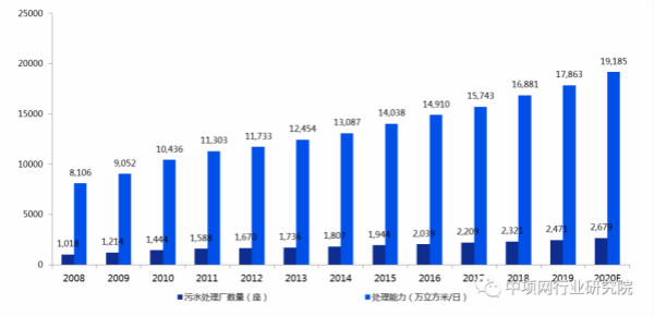 图1:2008~2020年中国污水处理厂数量及日处理能力