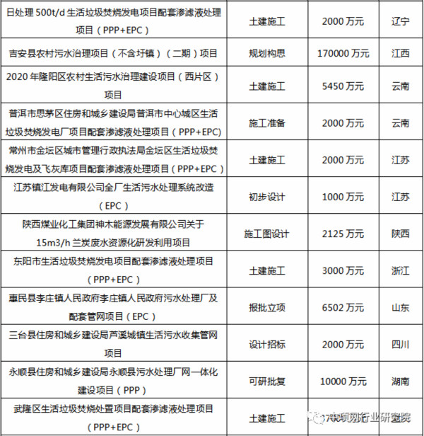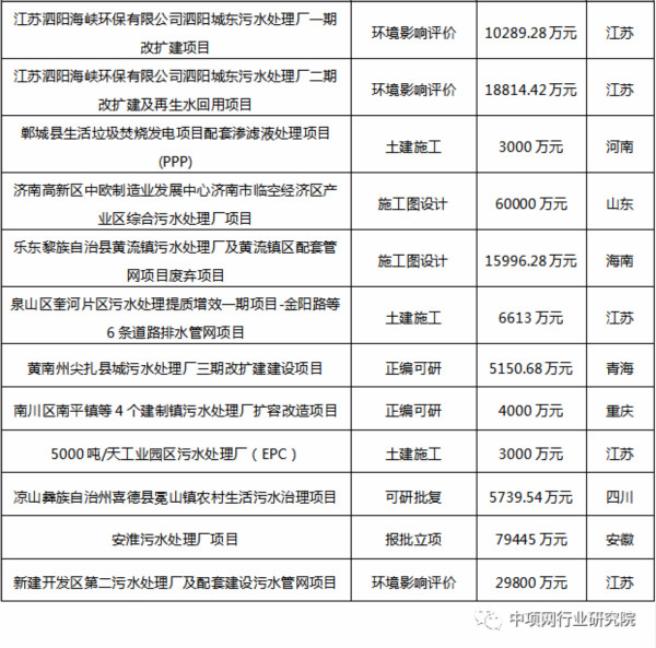 2021年度污水处理行业重点项目推荐